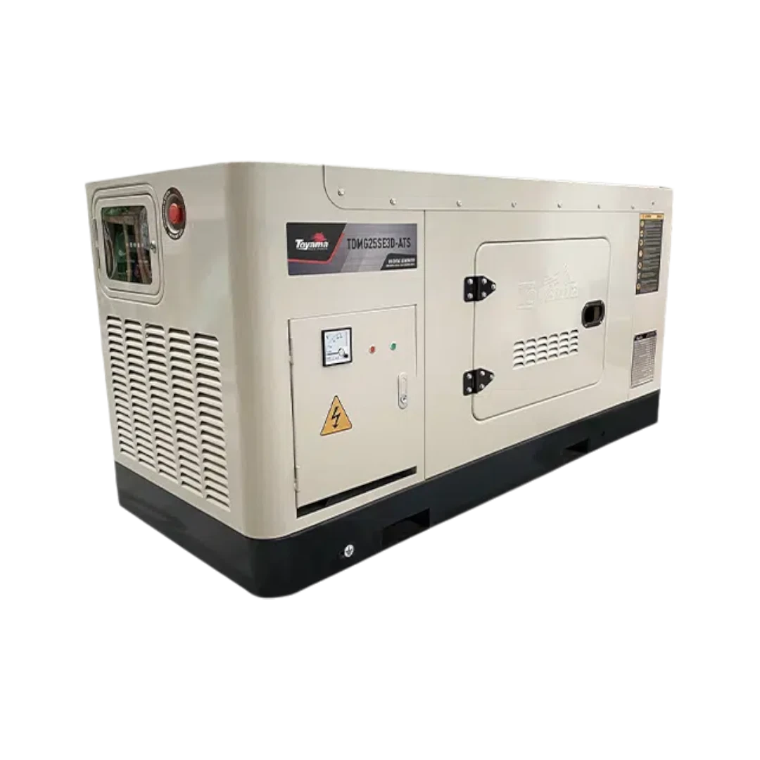 Planta Eléctrica Diésel Toyama 25 kVA 220V 3F, TDMG25SGE3D-ATS 254-100, Equipado con un motor a gasolina de 4 tiempos de 2540 cc de potencia máxima con arranque eléctrico. Dispone de un alternador síncrono, trifásico de 220 V, 4 polos, con 25 kVA de potencia nominal, excitador rotativo sin escobillas “Brushless”, equipado con un regulador electrónico automático de voltaje (AVR). El conjunto incluye dispositivos de protección contra alta temperatura del agua, baja presión de aceite y protección contra cortocircuitos. Compuesto por un carenado silenciado, fabricado en láminas de acero, con tratamiento acústico interno, que proporciona bajos niveles de emisiones sonoras, además, cuenta con puertas laterales que facilitan el acceso para la realización de mantenimientos periódicos. Satisface demandas frecuentes, siendo apto para diversas aplicaciones tales como: construcción civil, industrias, viviendas o en cualquier situación que requiera la necesidad de suministrar energía eléctrica, con activación manual o automática. Garantiza prestaciones diferenciadas, eficiencia y fiabilidad.