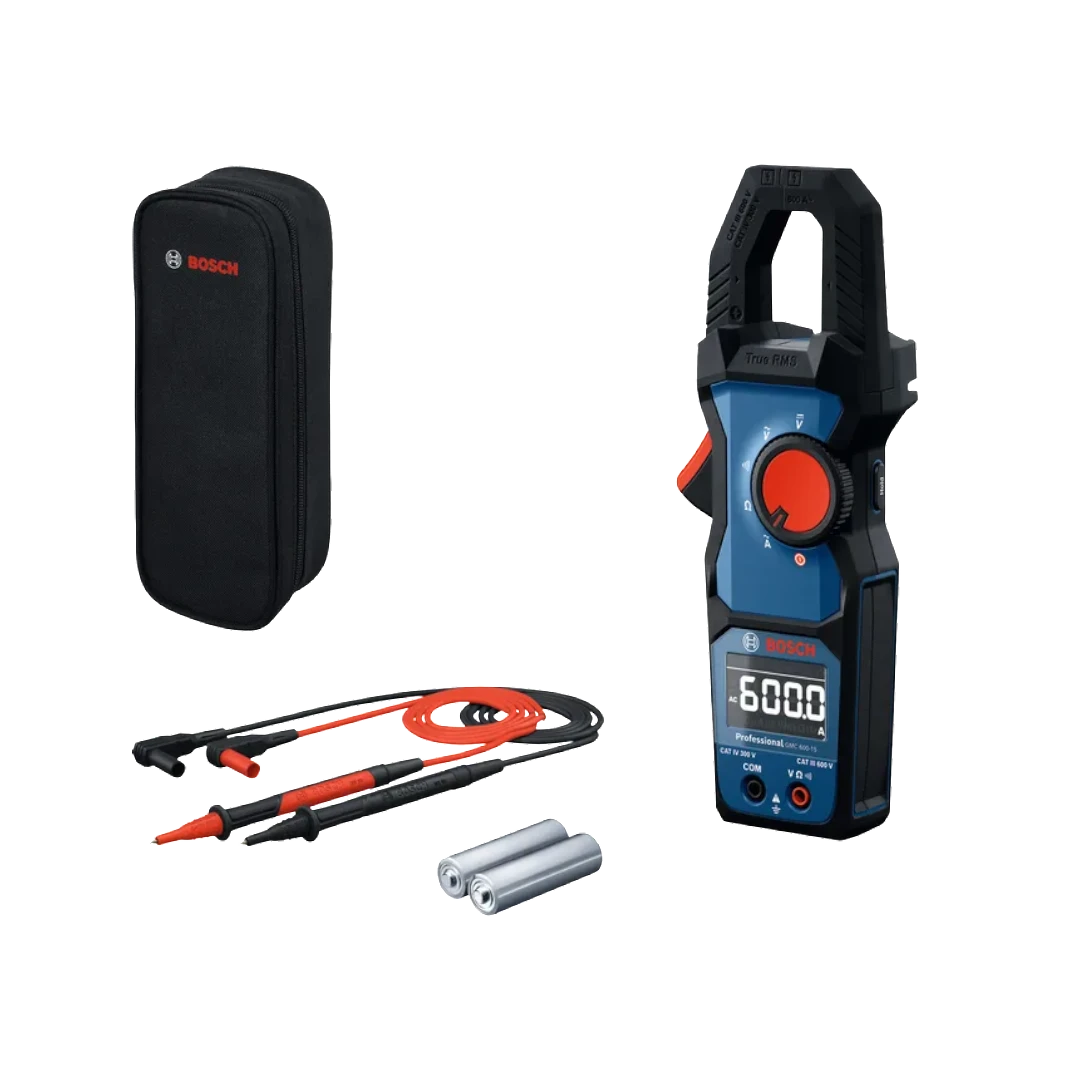 Pinza Amperimétrica Bosch 600ah 600v GMC 600-15, 0601077600, amperímetro diseñado para trabajar de manera más eficiente y recoger lecturas precisas para diferentes usos. Ofrece capacidades de medición versátiles, que incluyen corriente alterna de hasta 600 A y voltaje de CC y CA de hasta 600 V. La gran pantalla LCD invertida proporciona una visibilidad clara, mientras que la medición de valor eficaz verdadero (True RMS) garantiza su precisión. Con su robusto diseño con clasificación IP54, este amperímetro soporta caídas accidentales de hasta dos metros y condiciones adversas, lo que lo convierte en un compañero fiable en entornos de trabajo exigentes.