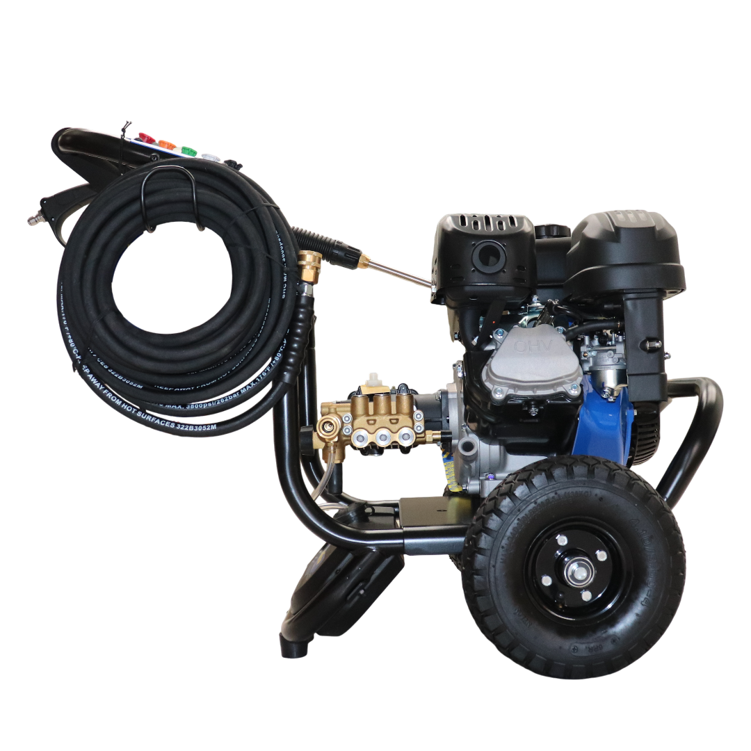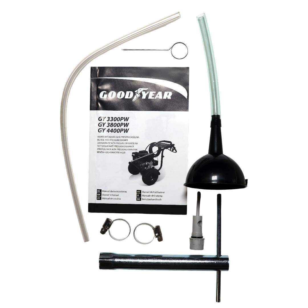Hidrolavadora Gasolina Goodyear 4089psi GY3800PW, impulsada por un motor OHV de 274 cc y 4 tiempos con arranque manual, ofrece una potencia nominal de 6,3 kW (6,3 HP) a 3600 rpm. Genera una presión de hasta 4089 psi (282 bar) con un caudal de 840 L/h, ideal para limpiezas intensas en exteriores, fachadas, terrazas o vehículos. Su motor está alimentado por un tanque de combustible de 5L.  y permite trabajar con agua caliente hasta 60 °C., depósito de detergente de 3L, protección de mango en neopreno, bomba con mirilla nivel de aceite y con sistema de acoples QD.